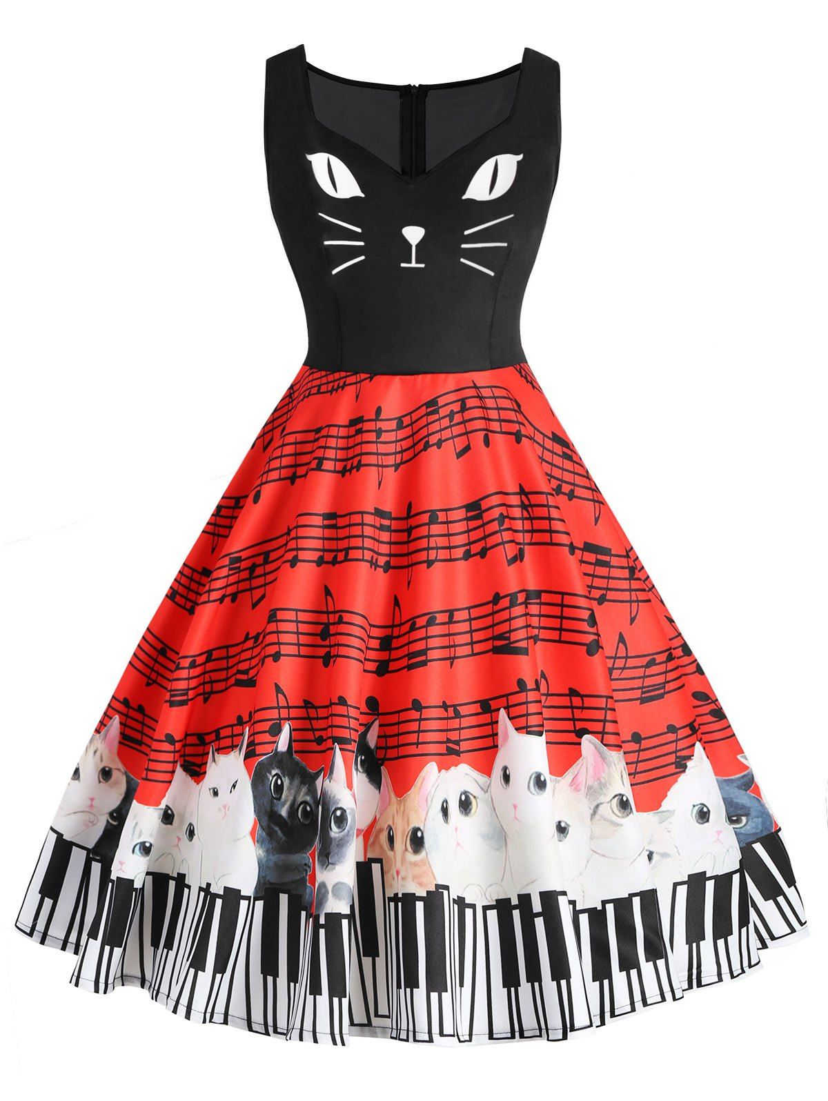 Plus Size Musical Note Cat Graphic Flare Dress Discounted at only: US$ 23.42